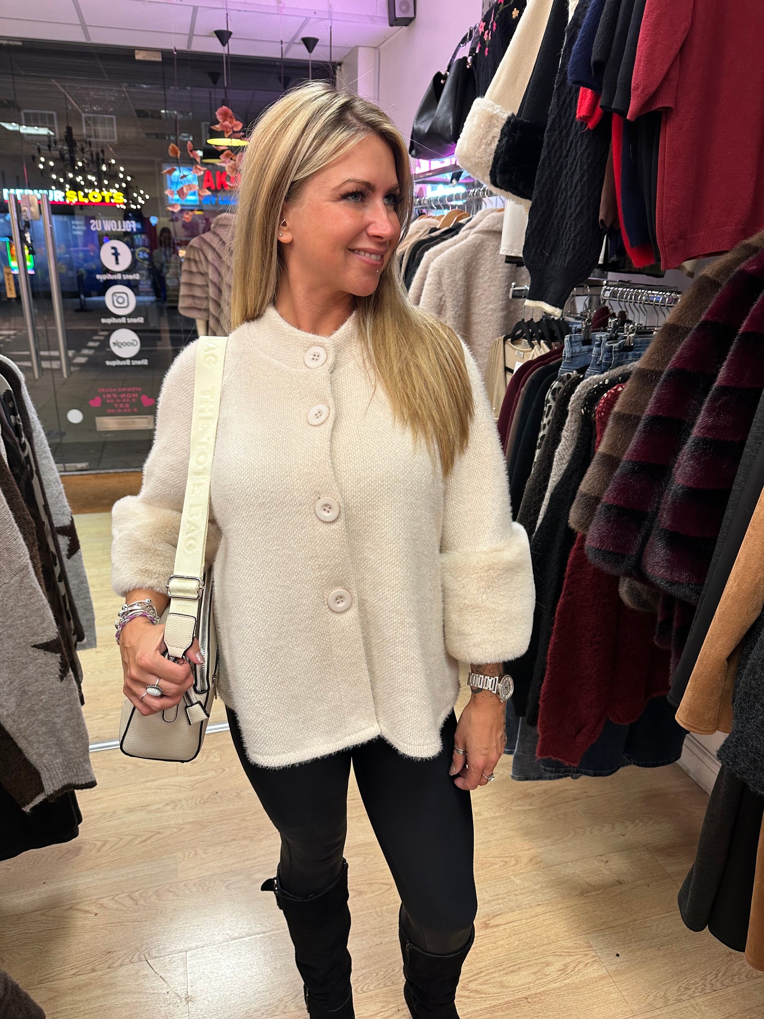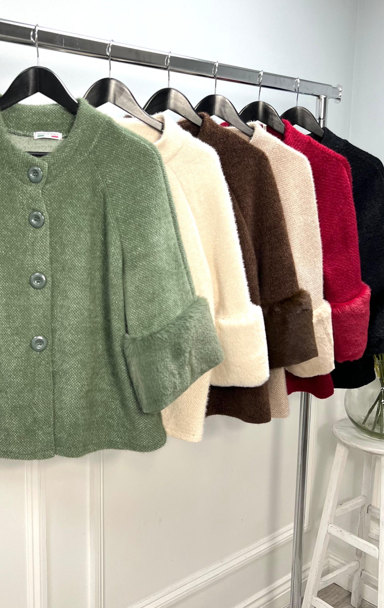 Very chic jacket. Soft Chenille fabric. Wide faux fur cuffs. One size fits up to 16