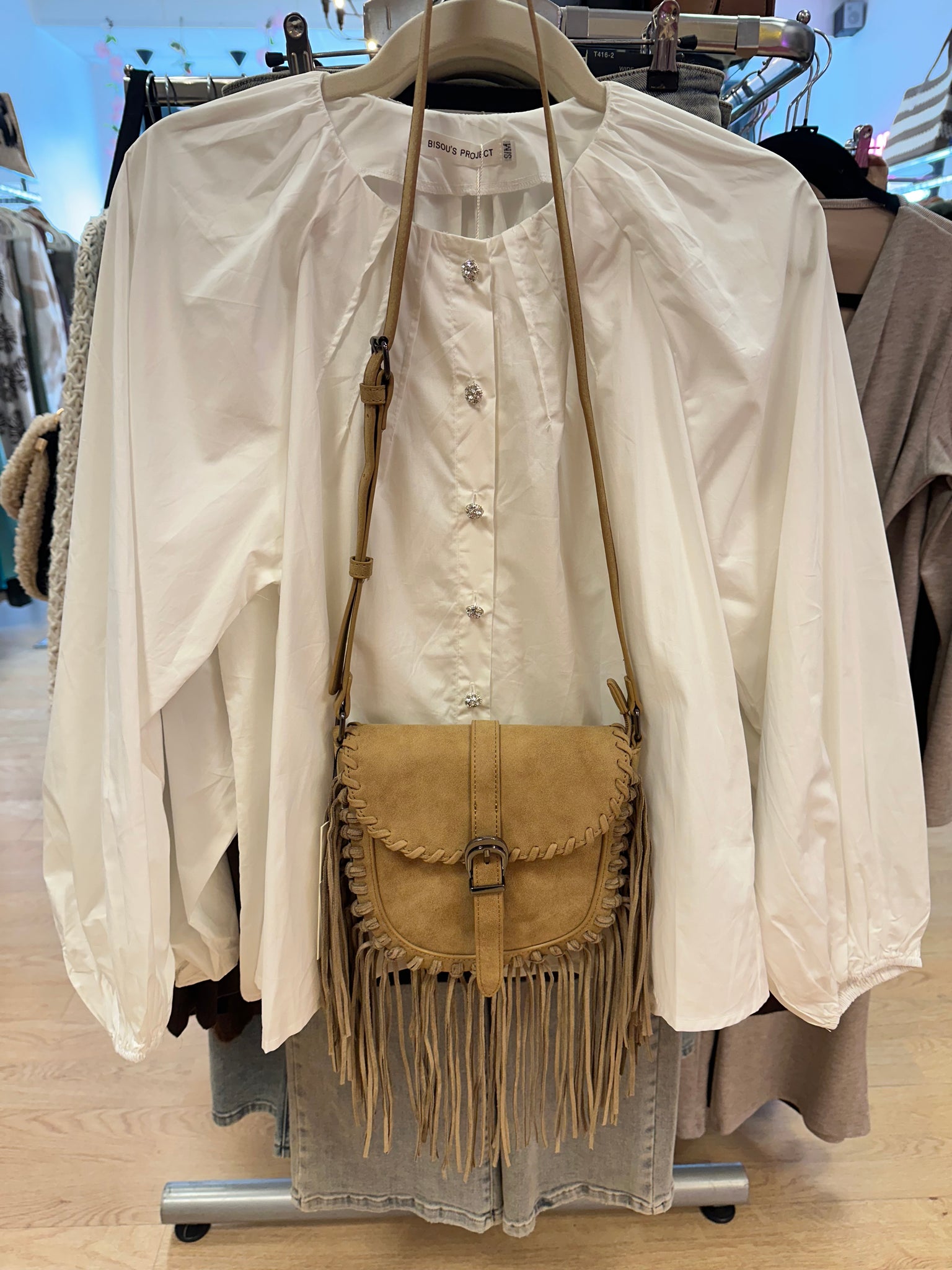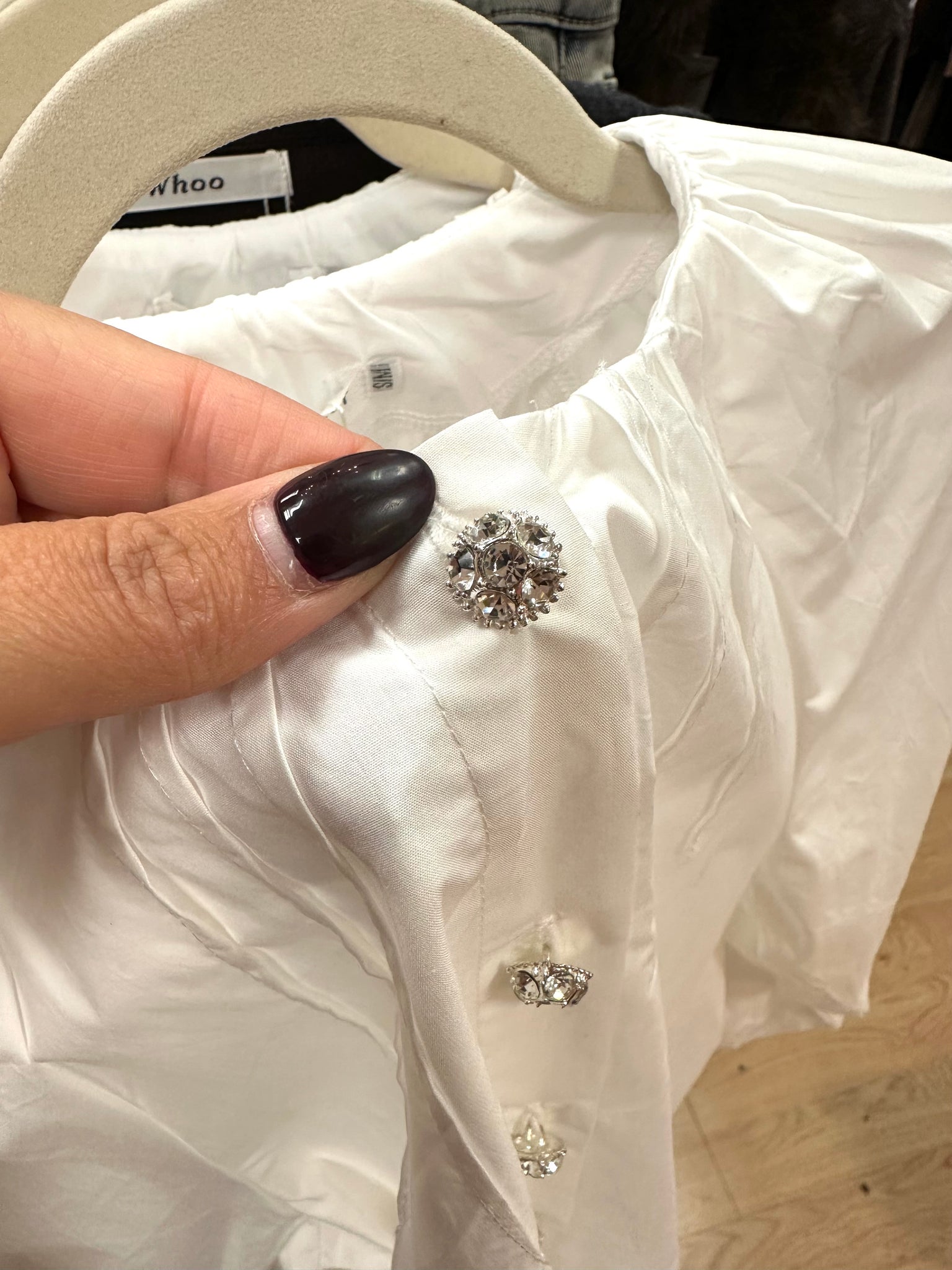 Crisp white cotton. Diamanté buttons. Puff sleeves elastic cuffs.