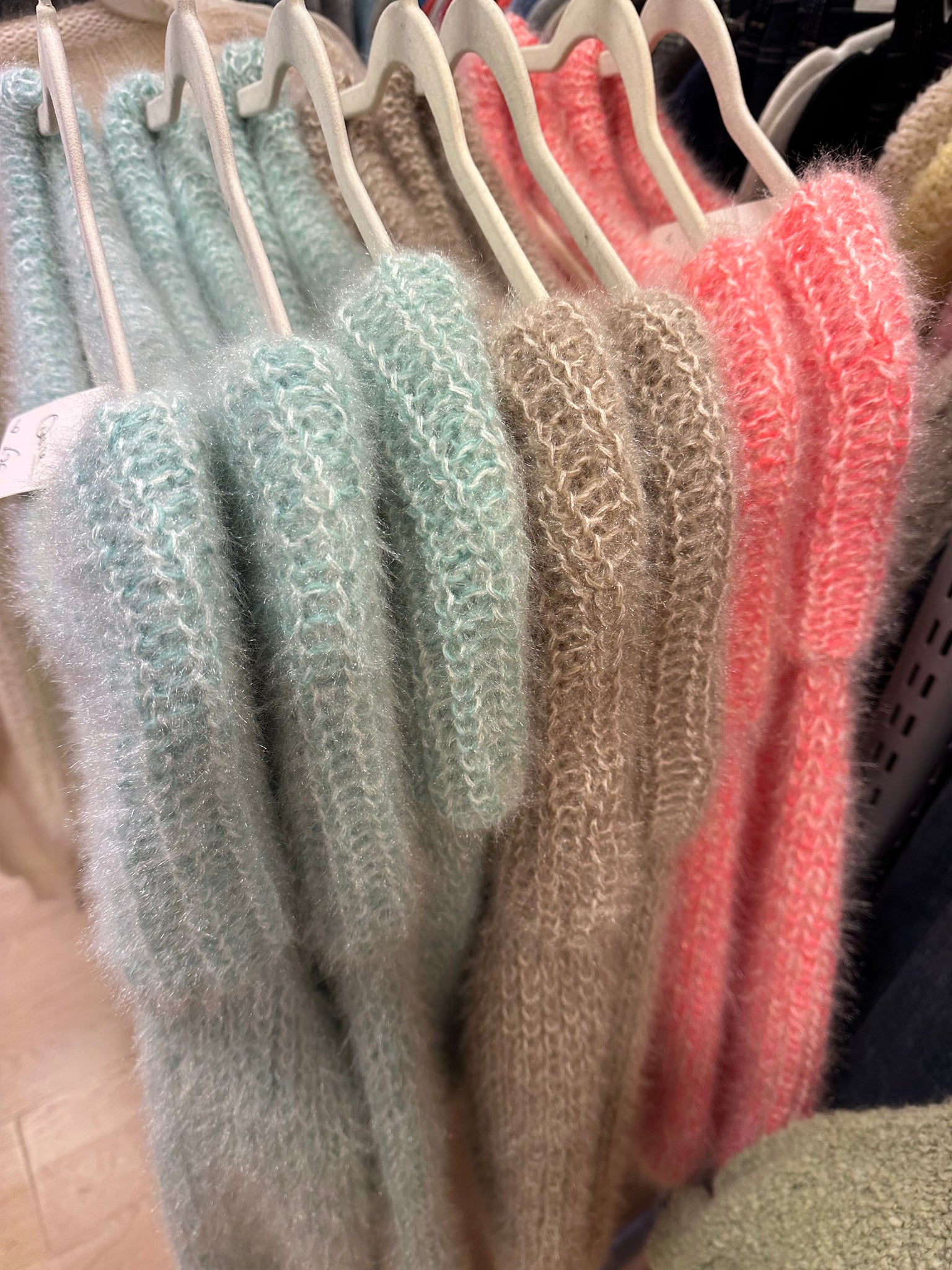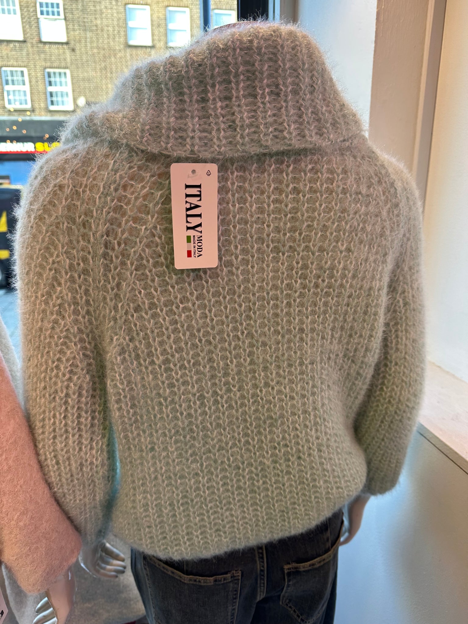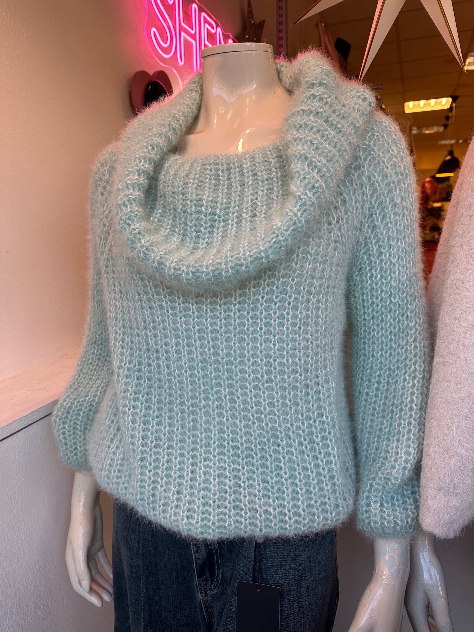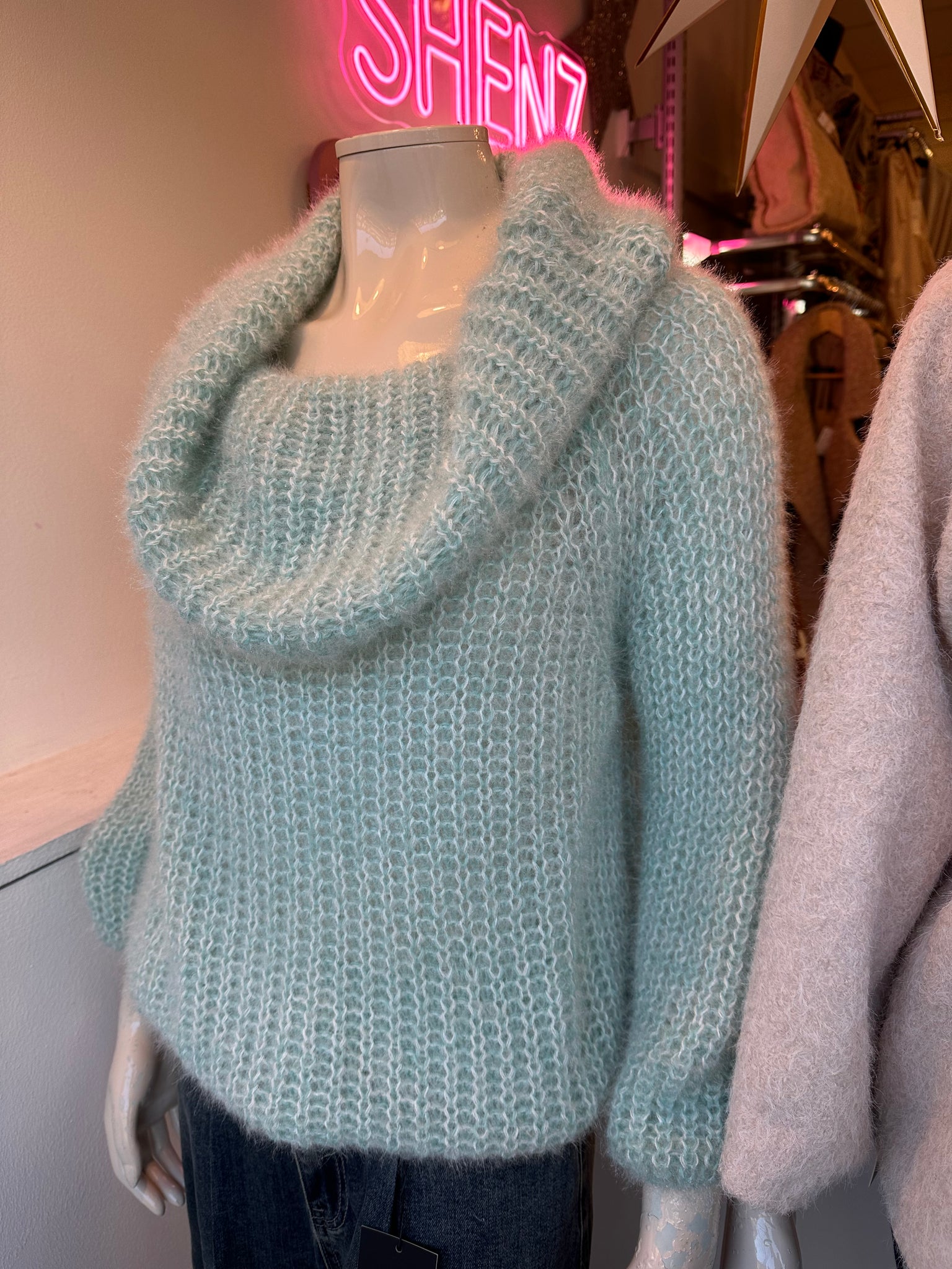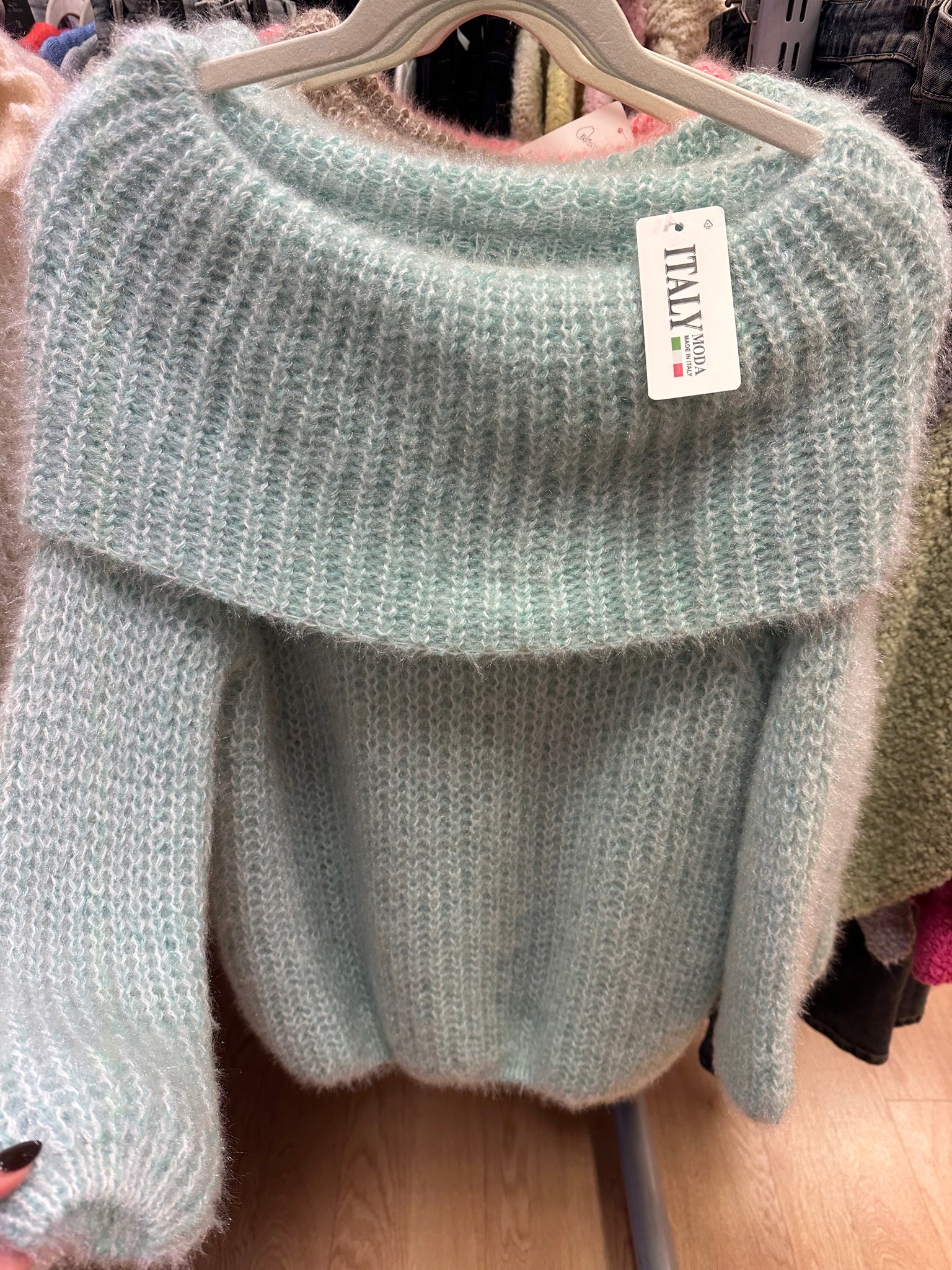 Fuzzy Jumper. Wear Off shoulder or as loose roll neck. Polyester blend knitted fabric. Super soft👌 One size fits 8-16